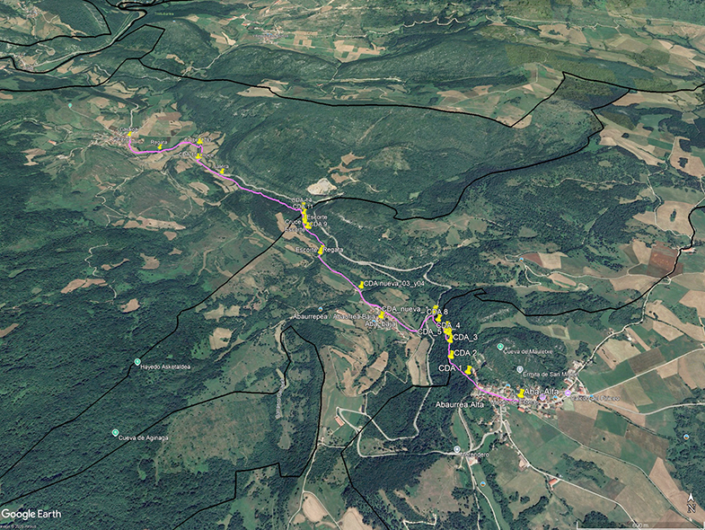 Iremos por la calle en dirección norte. Antes de las últimas casas, sale un camino, que desciende. Lo cogemos y a unos trescientos metros podemos ver la primera piedra de cañada. Después a doscientos metros de la primera, había otra piedra que no hemos encontrado durante este paseo. Seguimos descendiendo y veremos varias piedras de cañada, en total en este tramo hay ocho piedras de cañada. Al final antes de llegar al carretil, ya en termino de Abaurrepea se han puesto dos piedras nuevas, realizadas por los vecinos de Abaurrepea. Las piedras que se han hecho en este siglo tienen un punto después de la línea. Así podemos distinguir unas de otras.