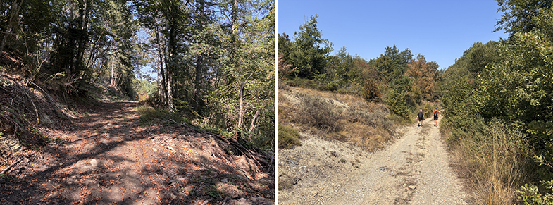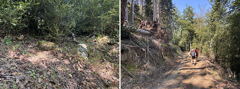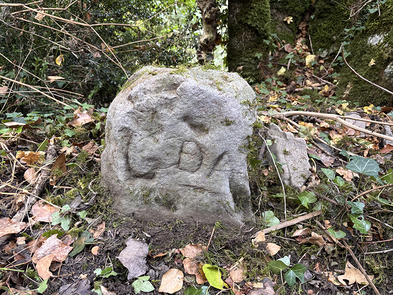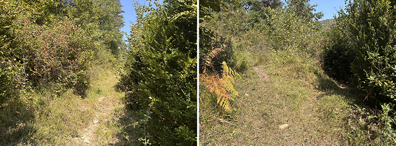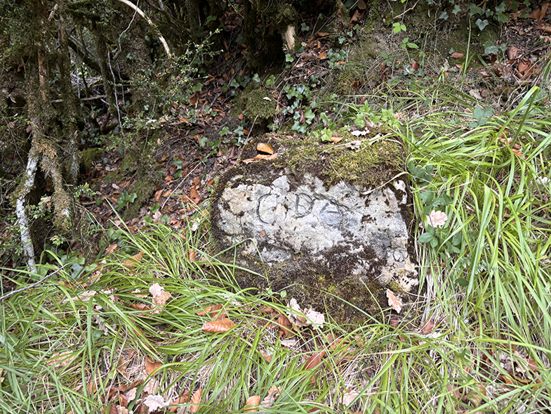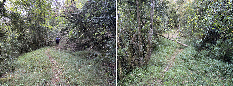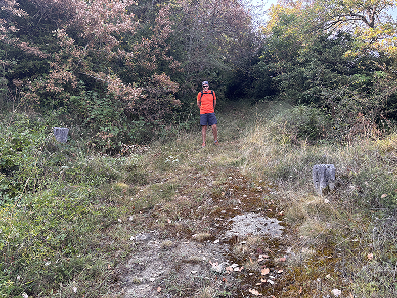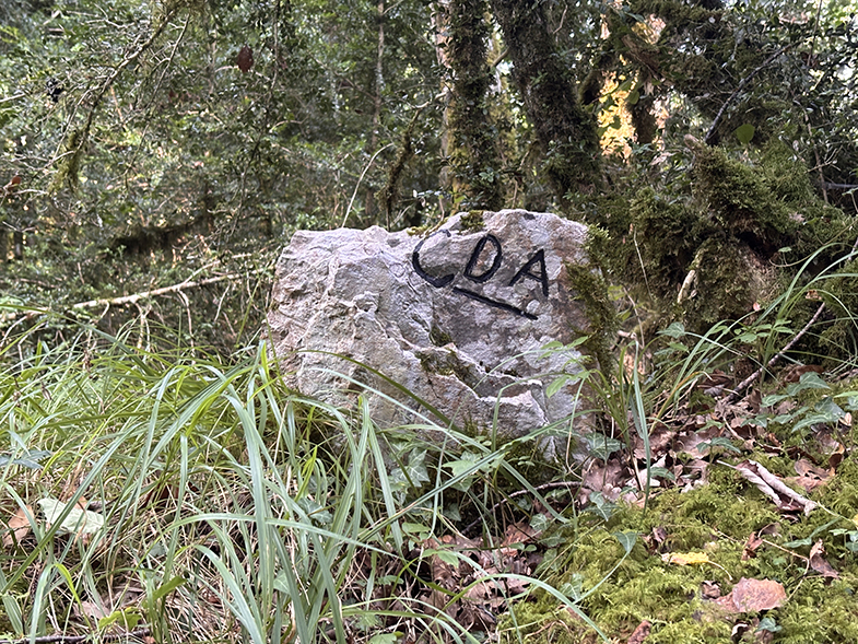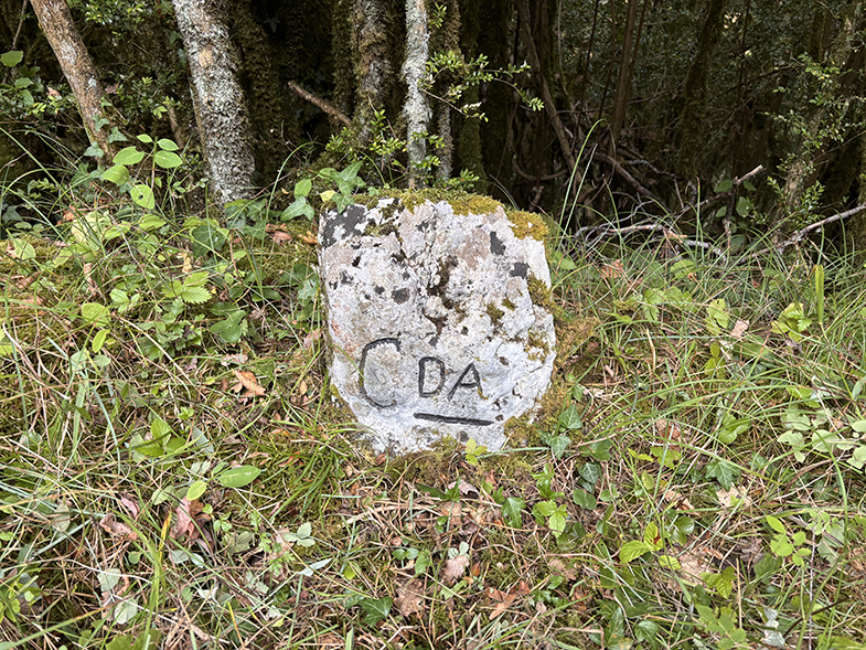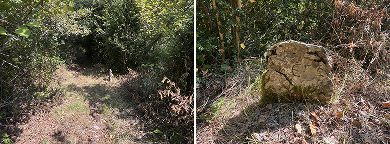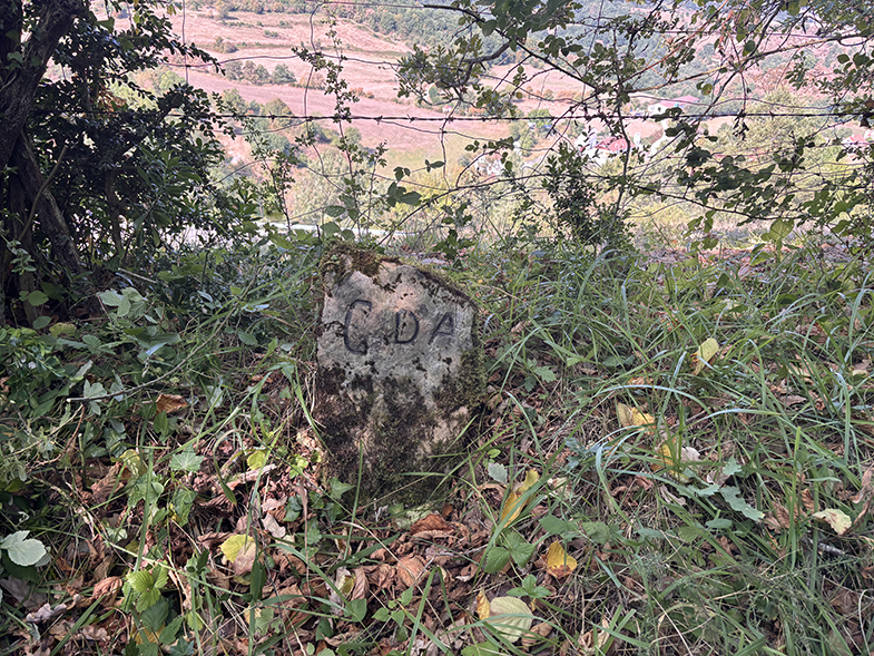 Volvemos a la senda y ascendemos ligeramente has un cruzo, cogemos a la derecha. Enseguida nos encontramos otro escorte, y nada más cruzarlo veremos a nuestra derecha otra piedra. Seguimos por la senda y de nuevo veremos otra piedra. Continuamos por la senda y al llegar a la muga con Garaioa veremos dos piedras y la piedra de la muga.