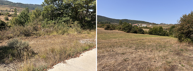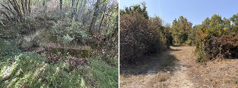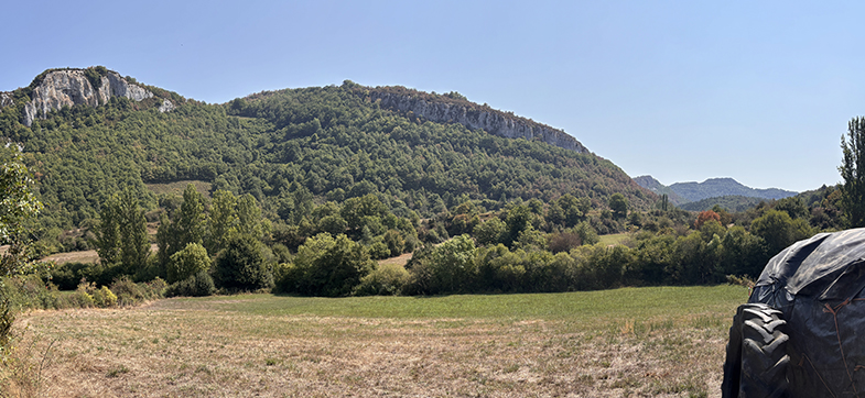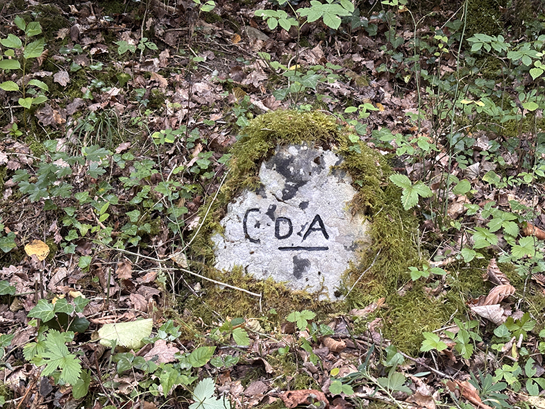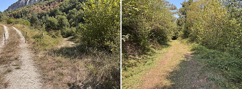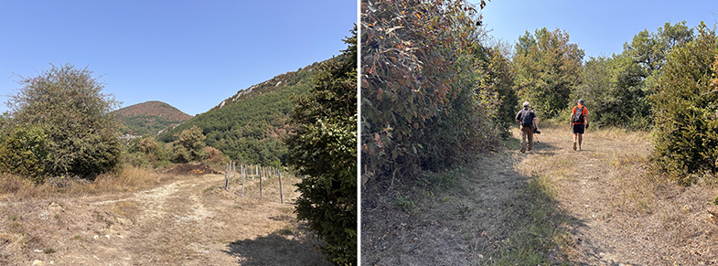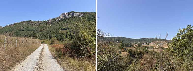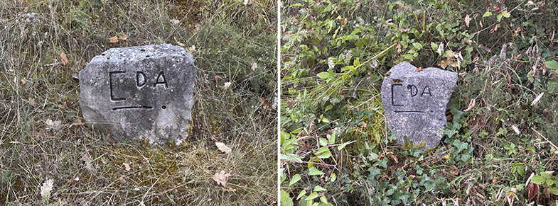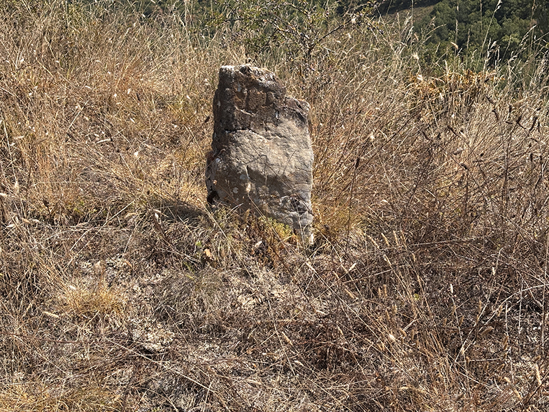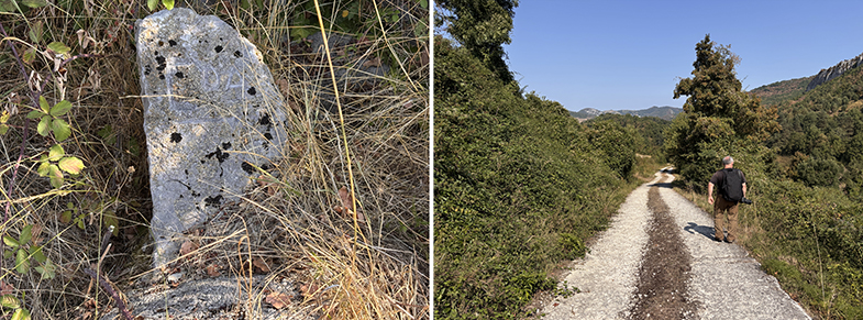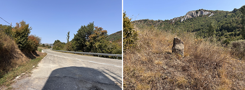 Descendemos por el carretil, a la derecha vemos el monte de Argibel. Pasamos una regata y cogemos a la derecha. Pasamos un portillo/escorte de alambre y continuamos por el camino. Al final del campo hay otro escorte que lo pasaremos. Nada más pasar el escorte, si queremos ver la siguiente piedra deberemos de ascender a nuestra izquierda unos 20/30 m. y podremos encontrar otra piedra de cañada.