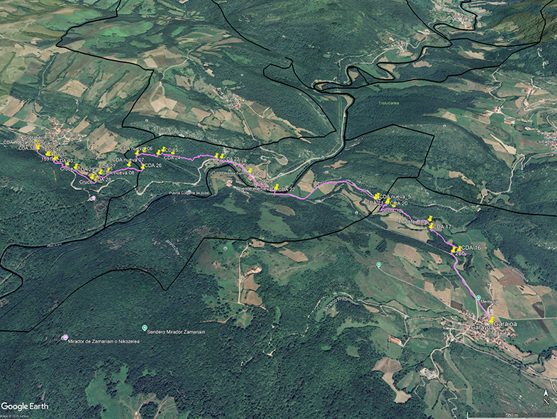 El recorrido conecta Garaioa → Aribe → Garralda, finalizando en un punto de encuentro social (Errotaberri).