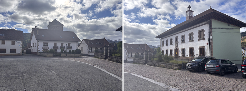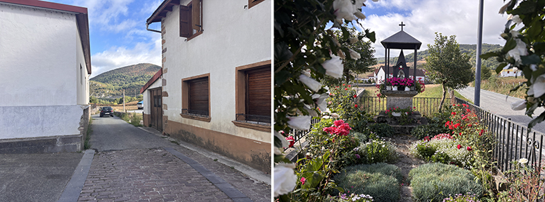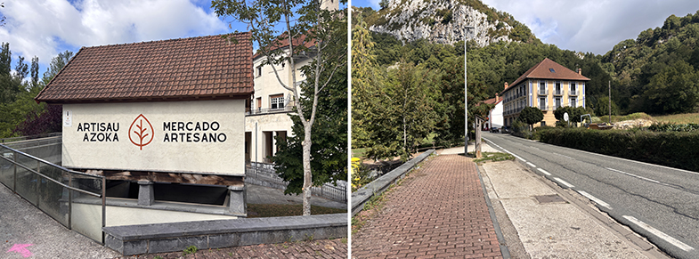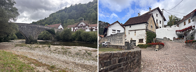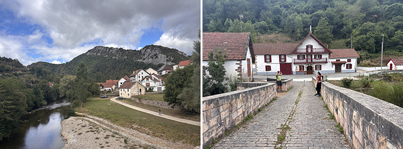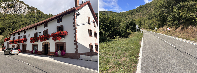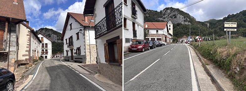 Aribe: Tras cruzar el puente, otra piedra de cañada junto a la pared → paso por el pueblo (hórreos de Domentx y de la casa del valle) → salida hacia Garralda.