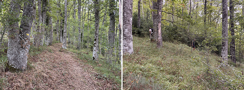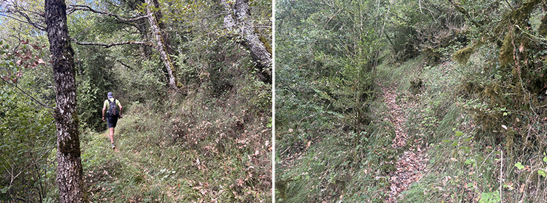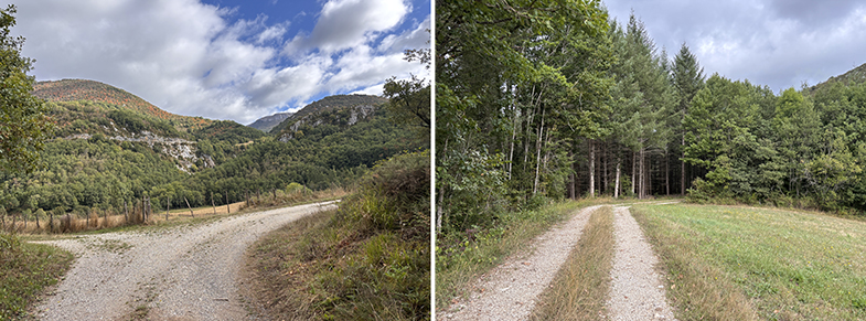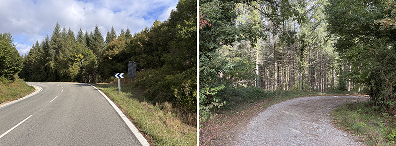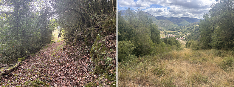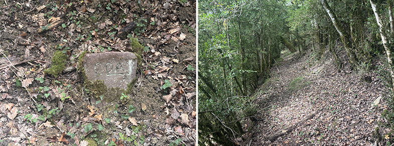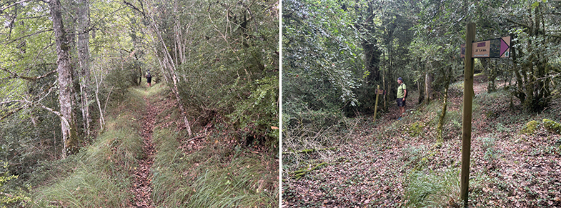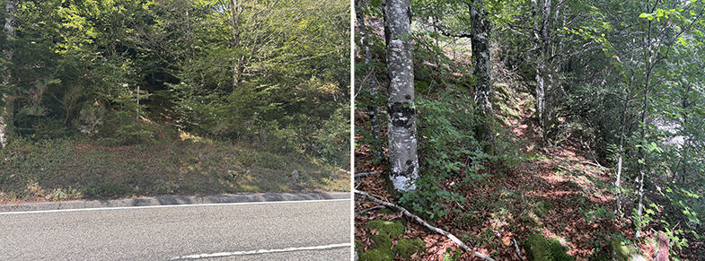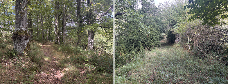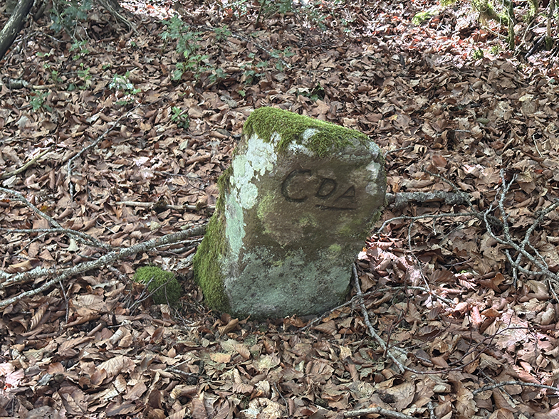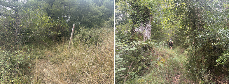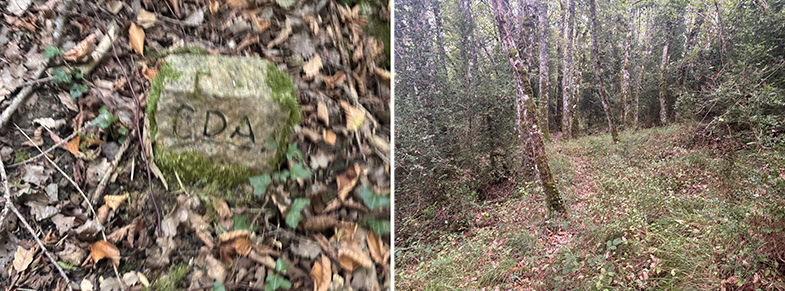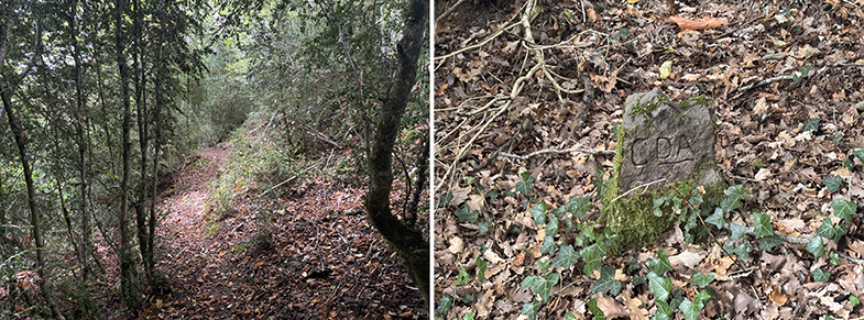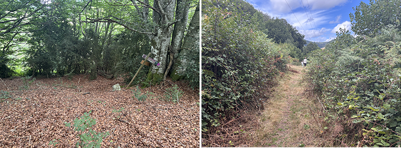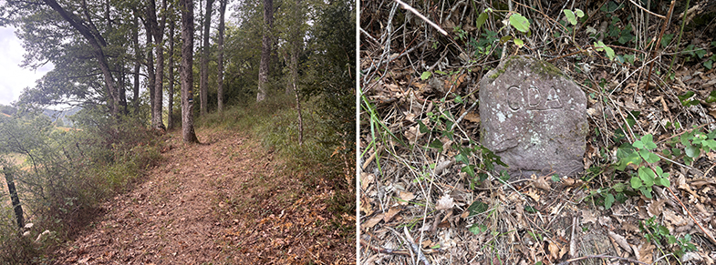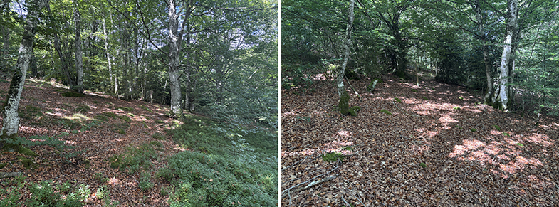 Cruces de senda y carretera → bosque de hayas y abis → piedras que marcan el ancho de la cañada.