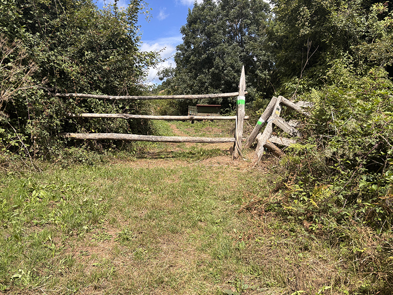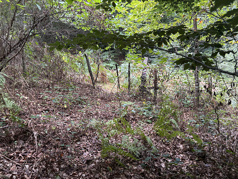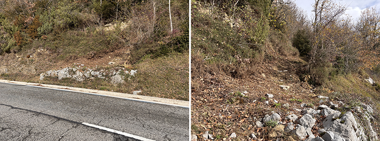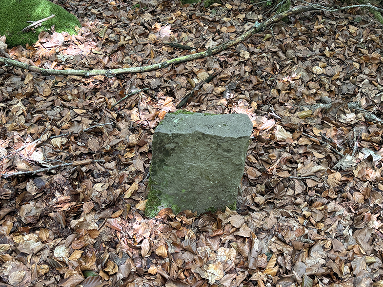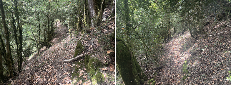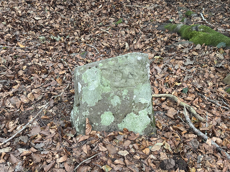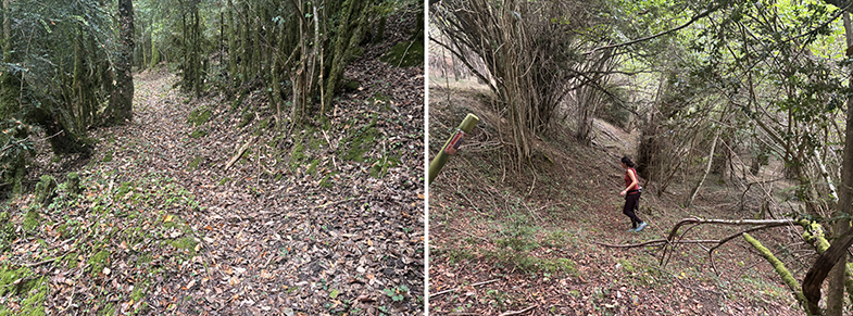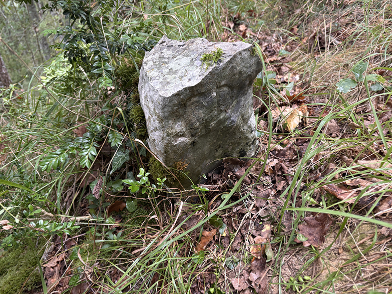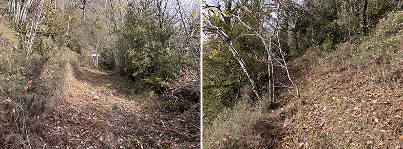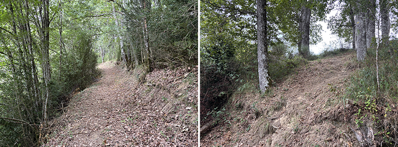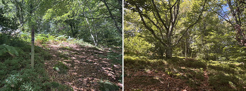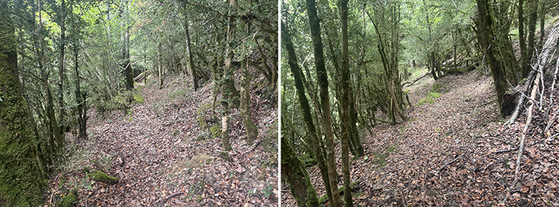 Cruces de senda y carretera → bosque de hayas y abis → piedras que marcan el ancho de la cañada.