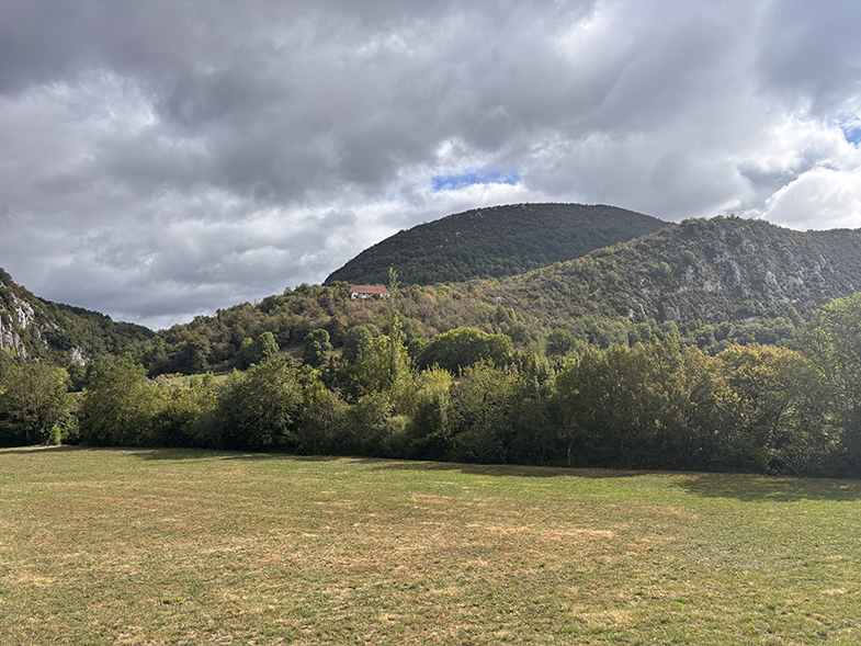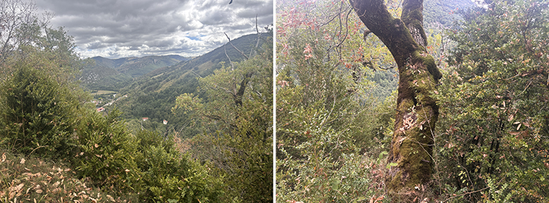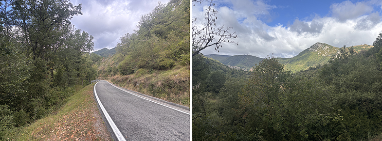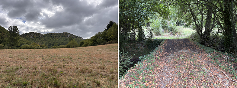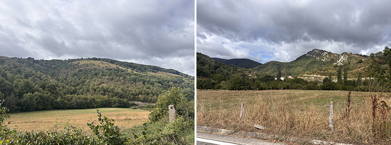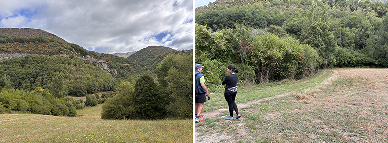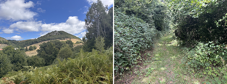 Se atraviesan distintos paisajes: campos, regatas, bosques de robles, bojes, hayas y avellanos.