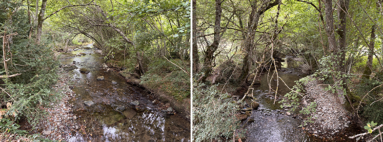 Regata y puente: Se cruza la regata por un puente → senda bordeando campos → nuevas piedras de cañada.