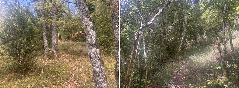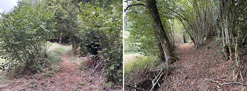 Senda estrecha entre robles y bojes.