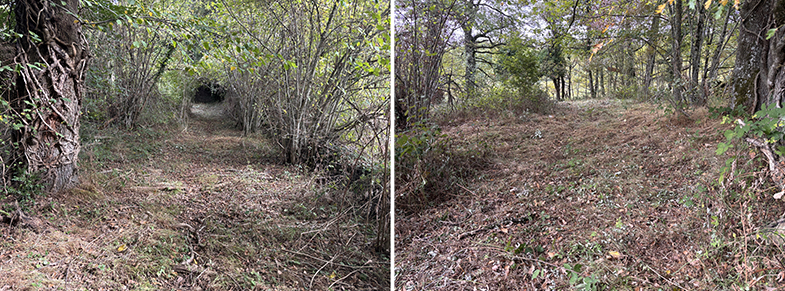 Cruce bajo tendido eléctrico → campo de avellanos → mirador con árbol usado antiguamente para atraer palomas.