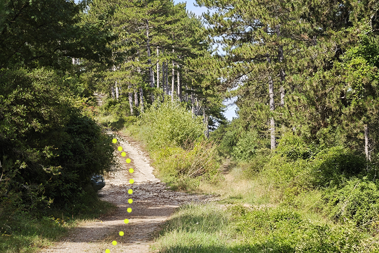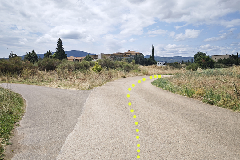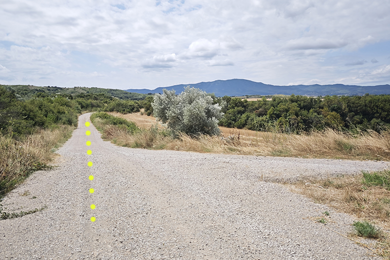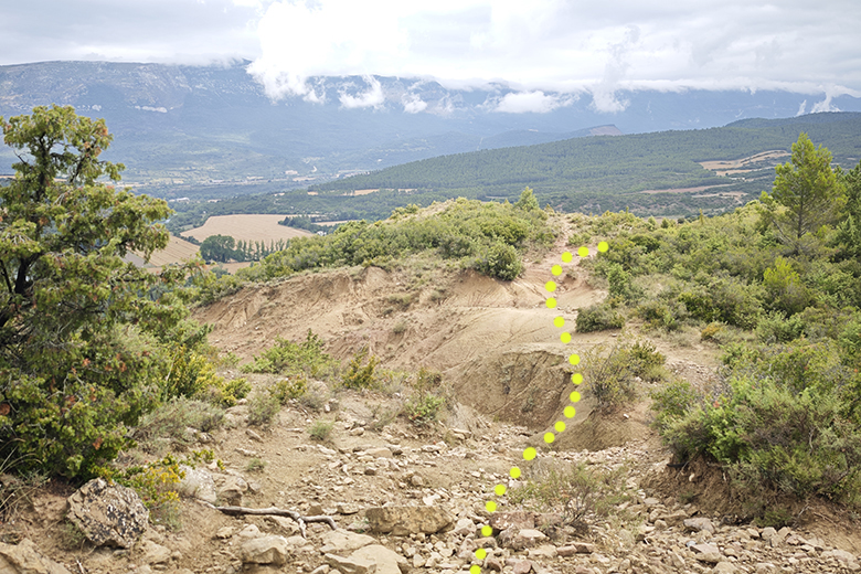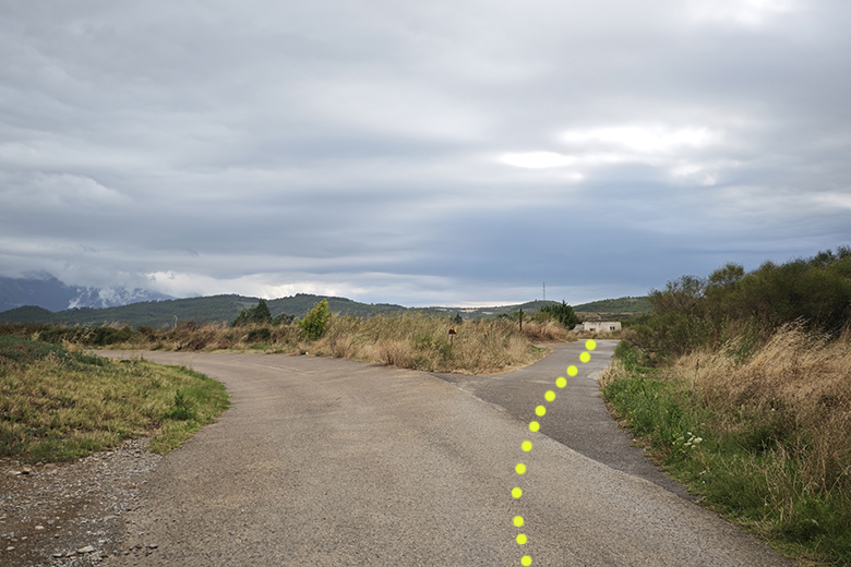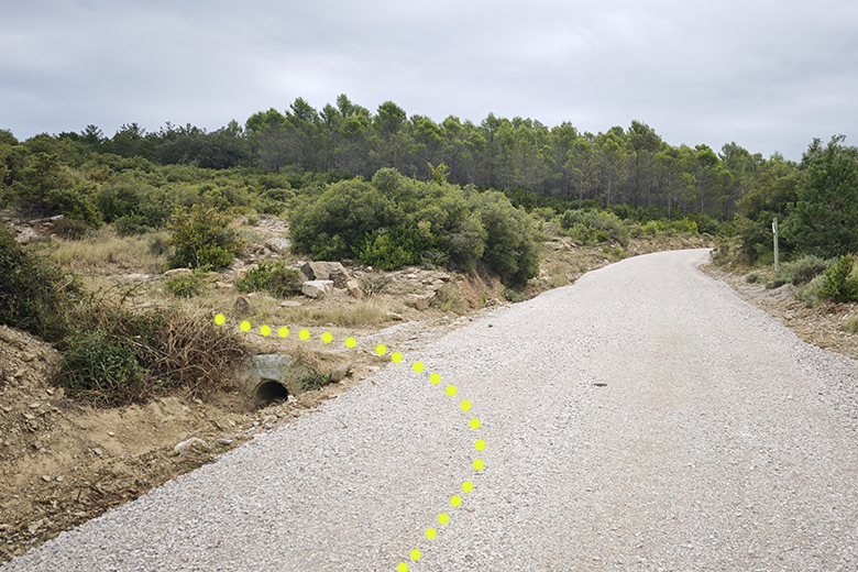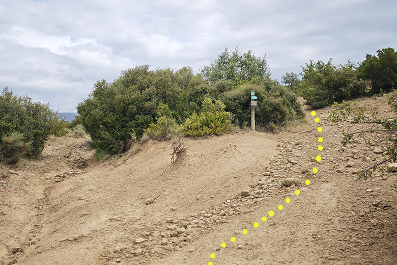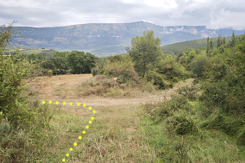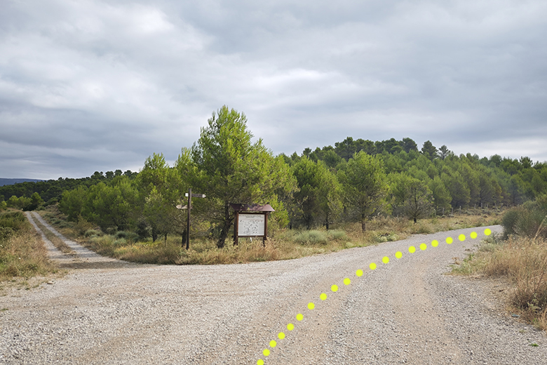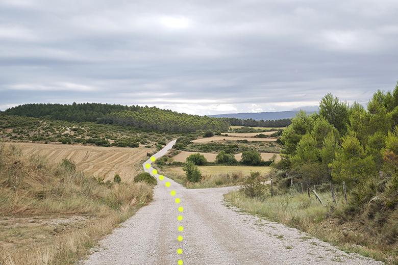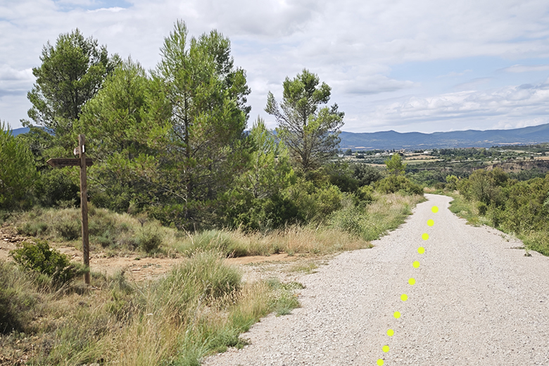 Prosigue el camino por un tramo de auténtica Cañada, con piso descarnado por el paso de los ganados y descompuesto en múltiples senderos, hasta las proximidades de Javier.