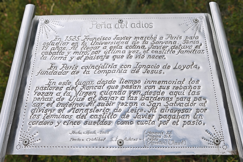 Una vez abandonado el casco, la ruta continua en suave ascenso por dicha Cañada a lo largo de 5 km, primero entre zonas de cultivo, para continuar por bosques de pinos, hasta alcanzar la Peña del Adiós. En este punto cuenta la leyenda que Francisco de Javier, en el año 1525, se despidió de su casa natal antes de marcharse a Paris y donde también, según la placa que hay en el lugar, los pastores que utilizaban la Cañada, rezaban a la Virgen de Ujué cuando bajaban a las Bardenas o a San Salvador de Leyre cuando se dirigían hacia el Roncal.